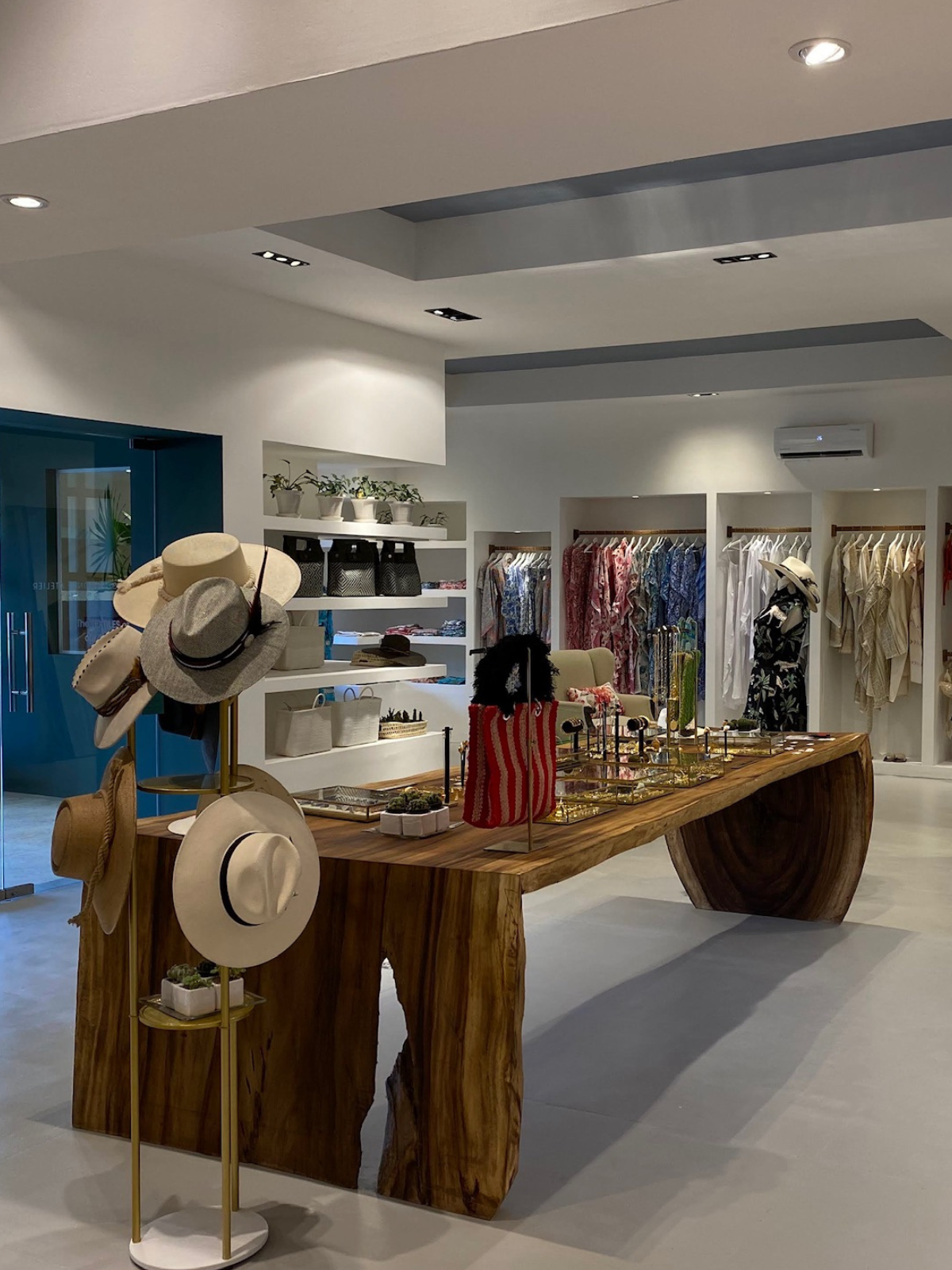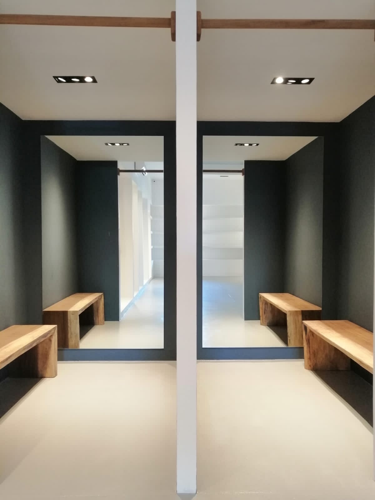 - Custom-Designed Dressing Rooms: The boutique’s dressing rooms were designed to be simple yet elegant. Full-sized mirrors framed in natural-edge parota wood were placed casually against the walls, adding a sense of relaxation and luxury. Comfortable seating areas with small sofas and side tables provided guests with a thoughtful, relaxed atmosphere while trying on garments.