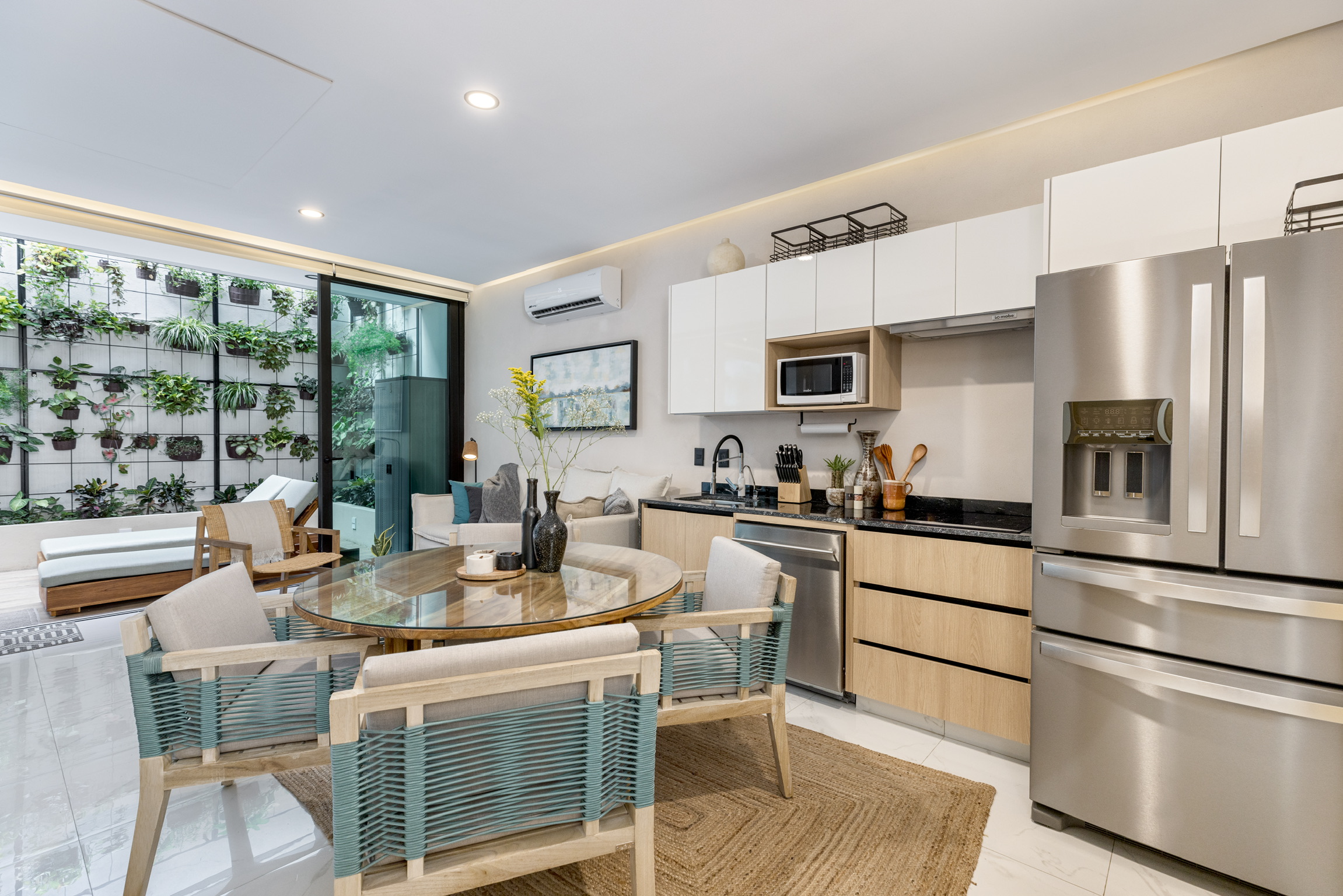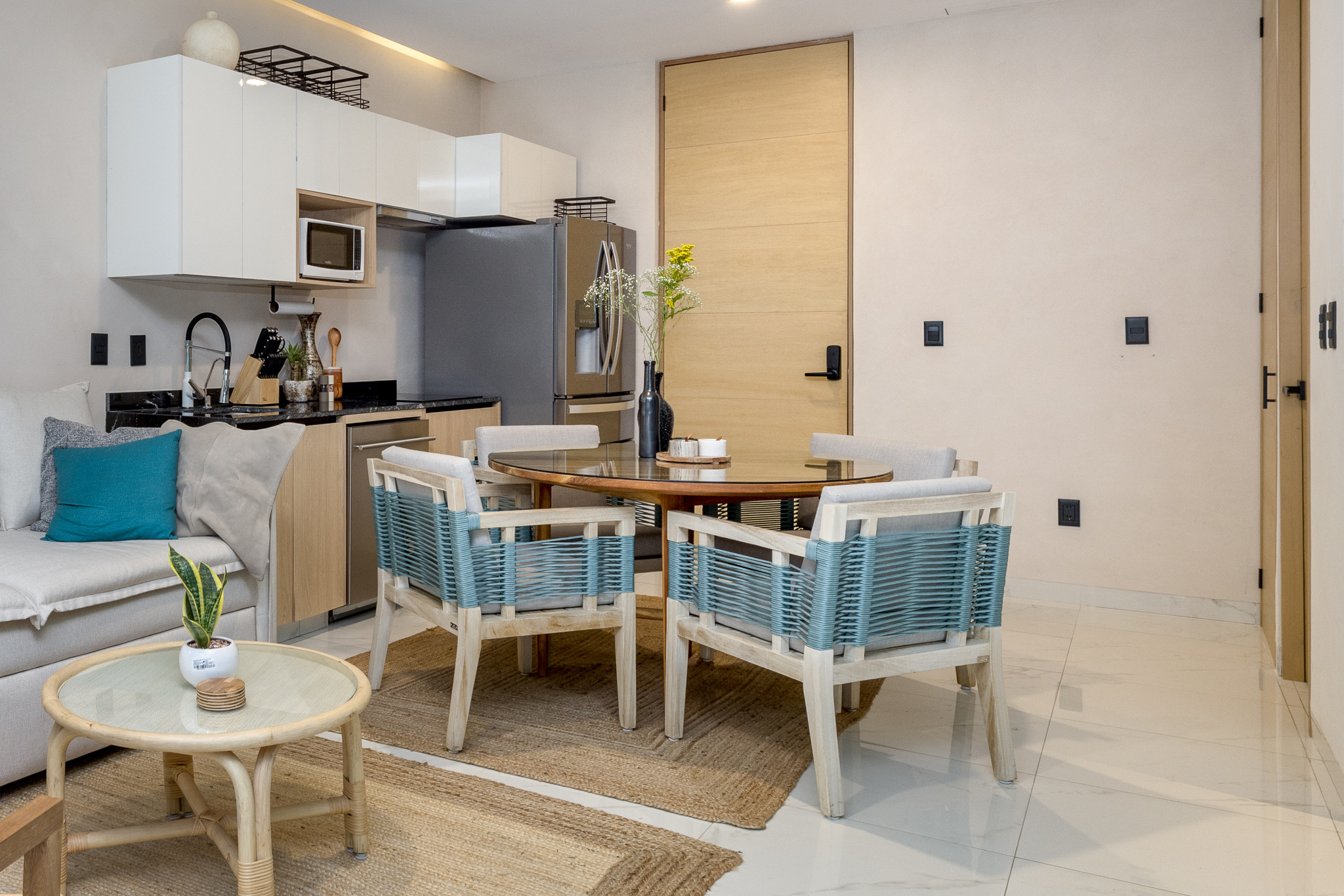 The living room was further refined with natural fiber jute rugs, a solid parota hand-carved side table, and a sleeper sofa upholstered in performance fabric. The dining area was furnished with a custom-designed solid Mexican parota wood dining table, complemented by four chairs crafted from local tropical wood with a bleached finish, inspired by traditional Mexican rope furniture construction. Custom art was commissioned, including a striking painting above the sofa, adding a unique and personal touch to the space.