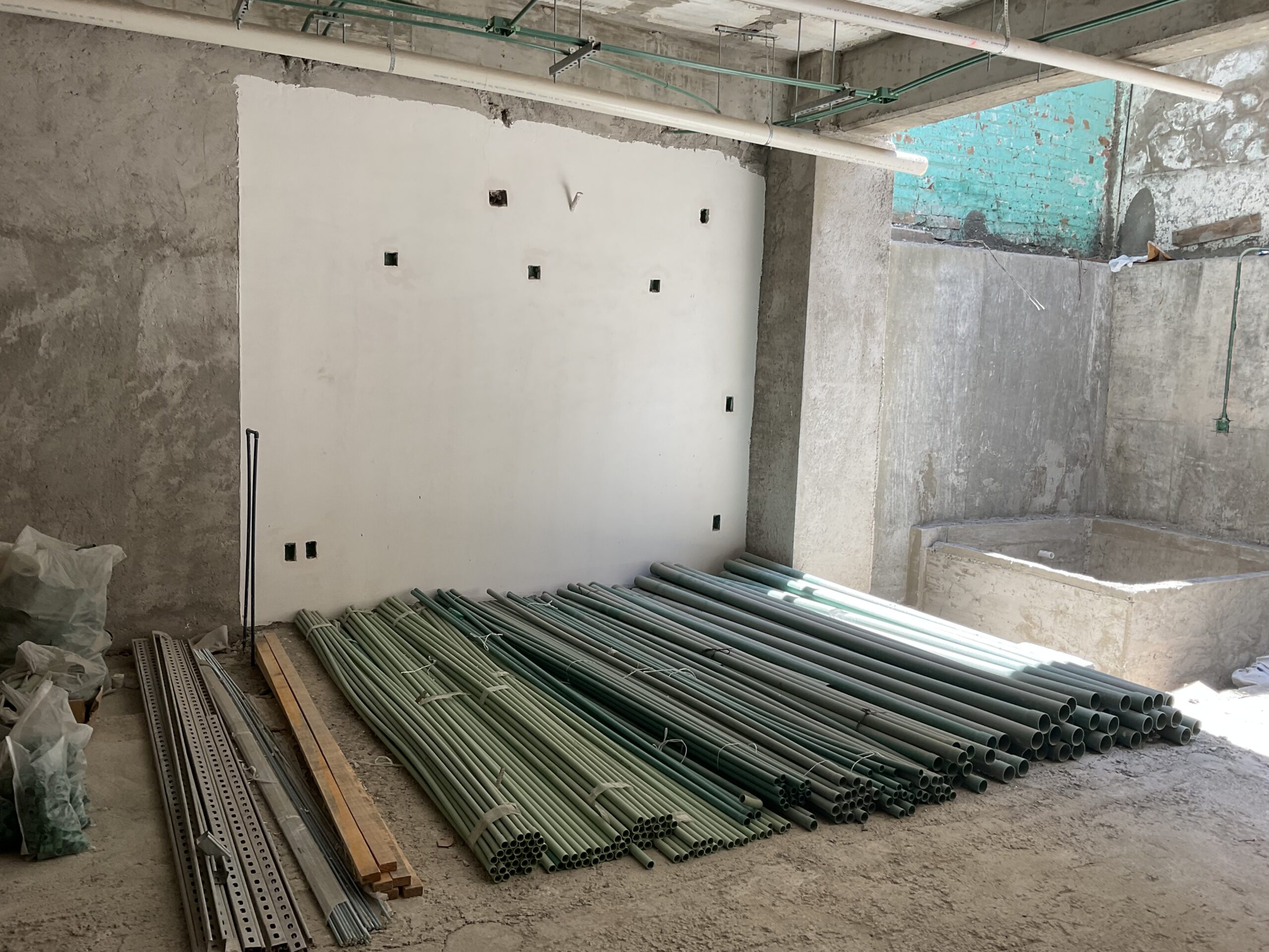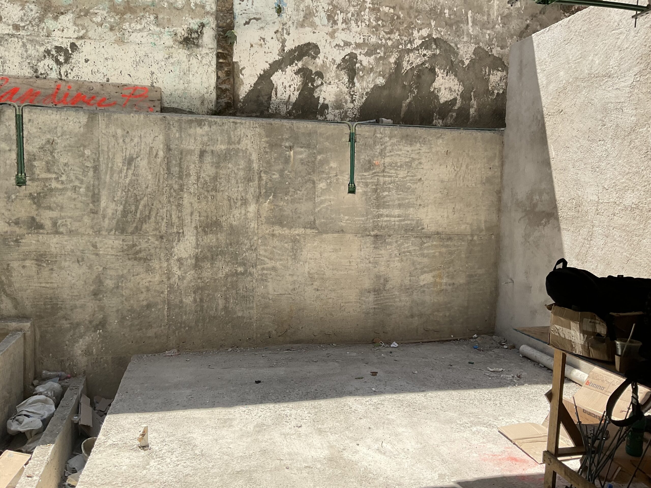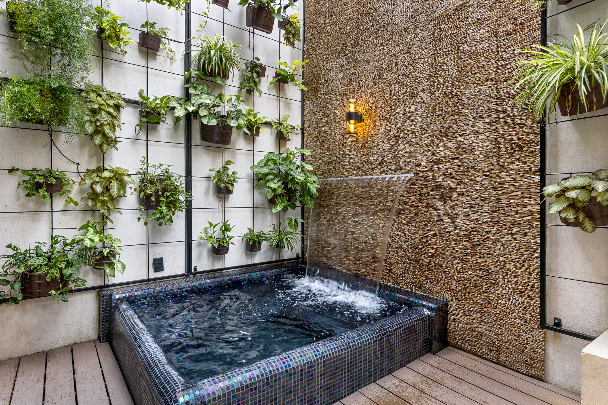 The outdoor terrace, initially an unremarkable area, was transformed into a hidden oasis. A living plant green wall was installed, adding a biophilic and organic element that contrasted beautifully with the three surrounding concrete walls.