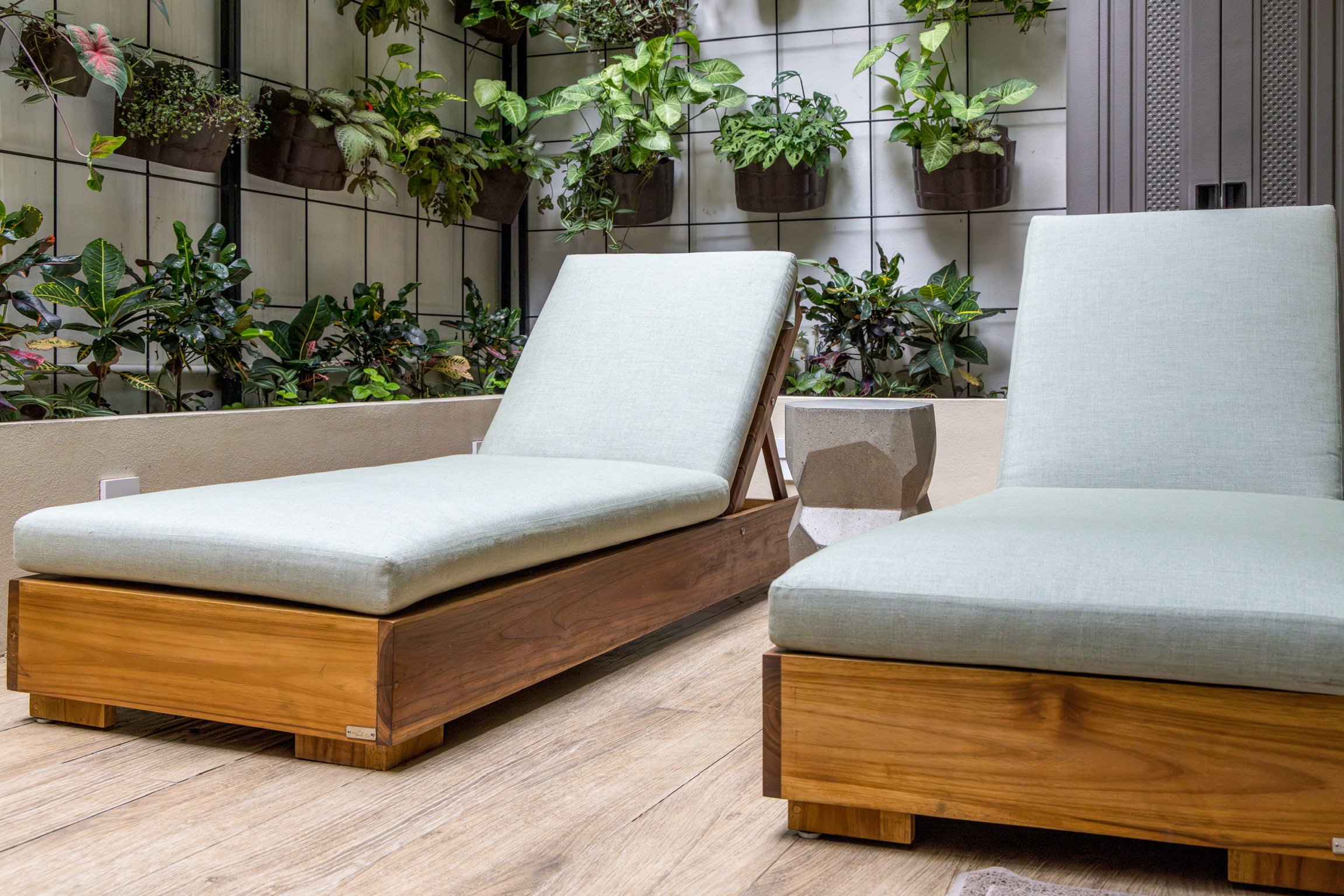 The terrace was further refined with designer teak chaise lounges upholstered in custom performance fabric, and a concrete drink table, creating a luxurious outdoor retreat.