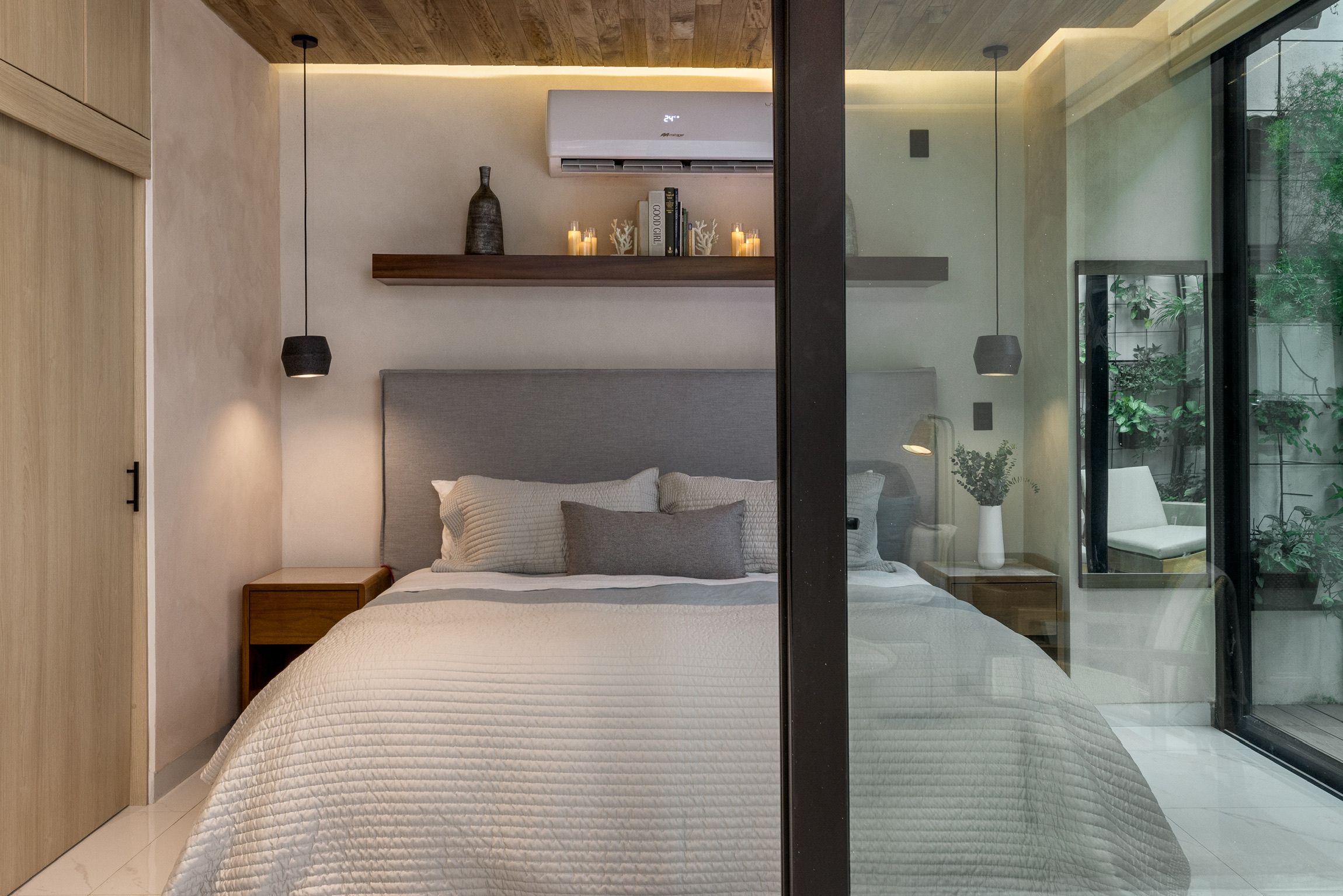 From the outset, several issues needed to be addressed during the pre-construction phase to avoid costly revisions later. The condominium’s small size, partial wall construction between the living room and bedroom, and the absence of a designated area for television installation posed immediate concerns. Additionally, the concrete walls and ceiling created a cave-like, acoustically reflective environment that was far from the client’s vision of comfort and luxury. The outdoor terrace, which was originally an underdeveloped space with only a planned dipping pool, also needed significant enhancements to become a usable and appealing feature for potential renters.